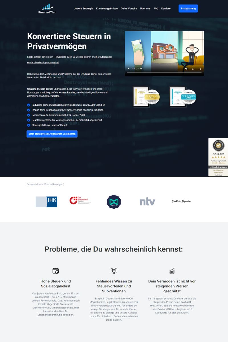 Dabei handelt es sich um eine schlüsselfertige Webseite für Finanzberater, bei der du nur noch deine Texte, Bilder und Texte ausfüllen musst. Alles andere wie Hosting, Verwaltung und Updates sind inklusive.